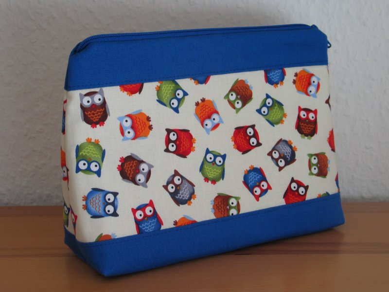 Die bunten Eulen harmonieren wunderbar mit dem blauen Uni-Stoff und dem farblich passenden Reißverschluss.